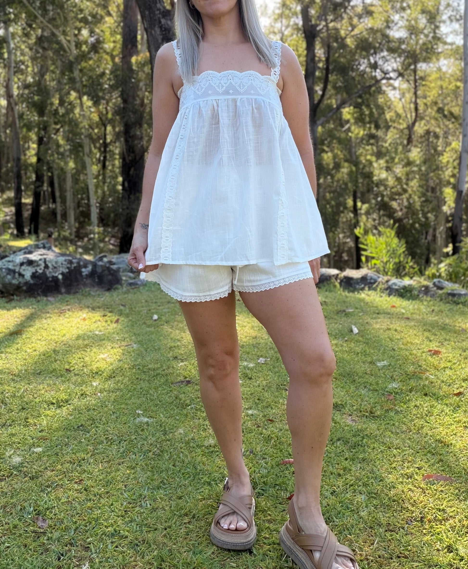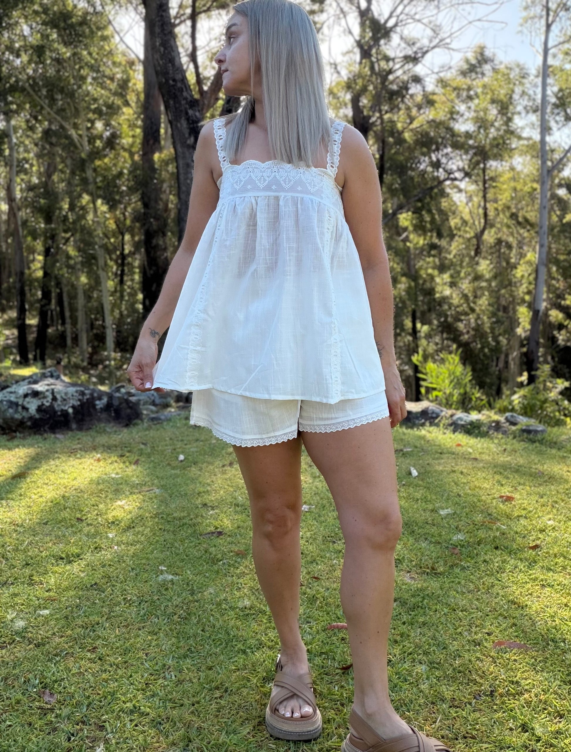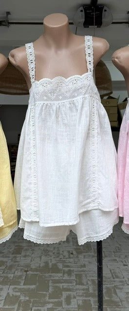 Light, airy, and beautifully detailed, this White Cotton Set is designed for easy summer dressing. The baby style floaty top features sweet embroidered detailing around the neckline, while the matching cotton shorts are fully lined, finished with embroidery along the hem and practical pockets. A relaxed yet feminine set you’ll reach for time and time again