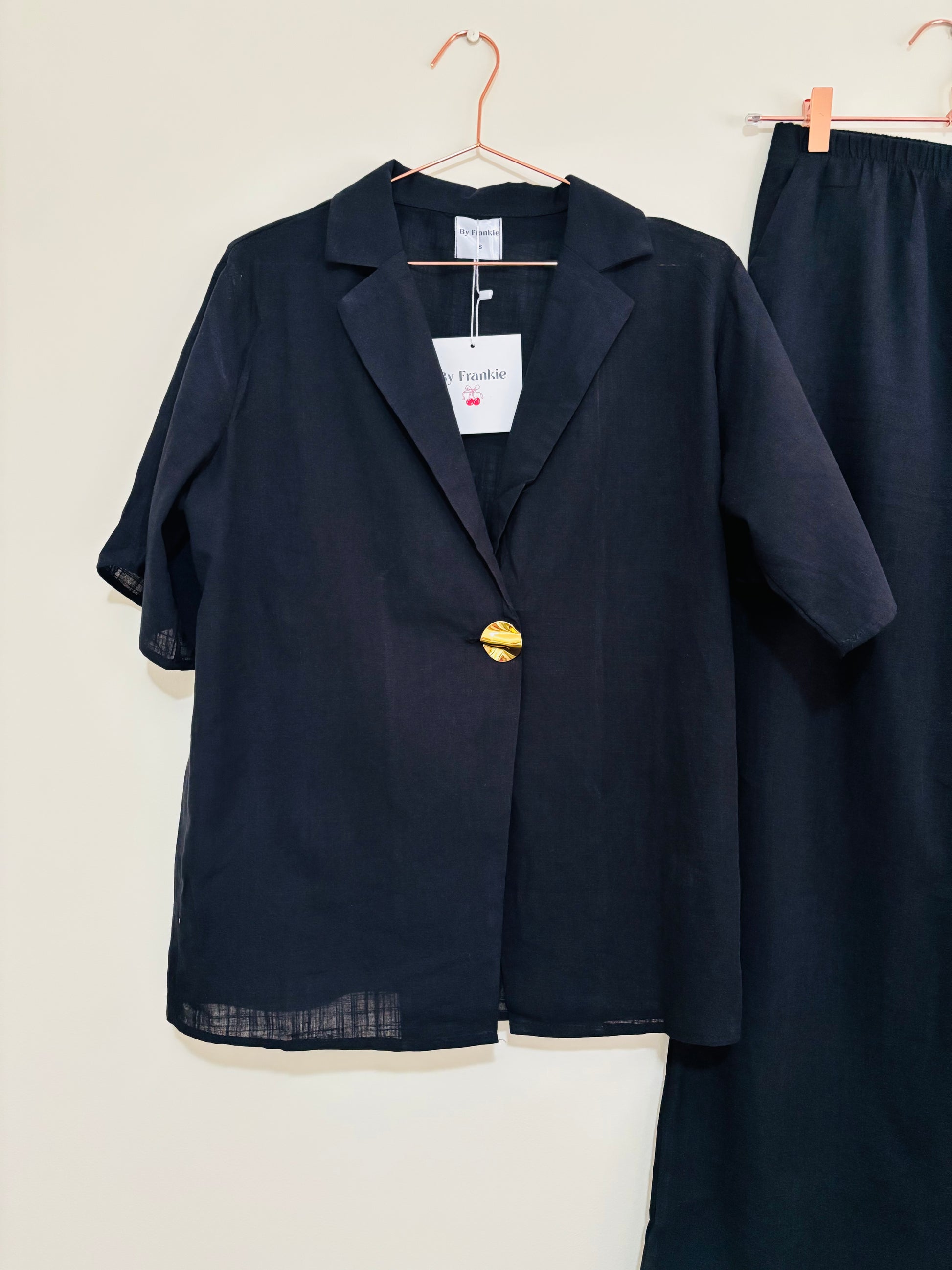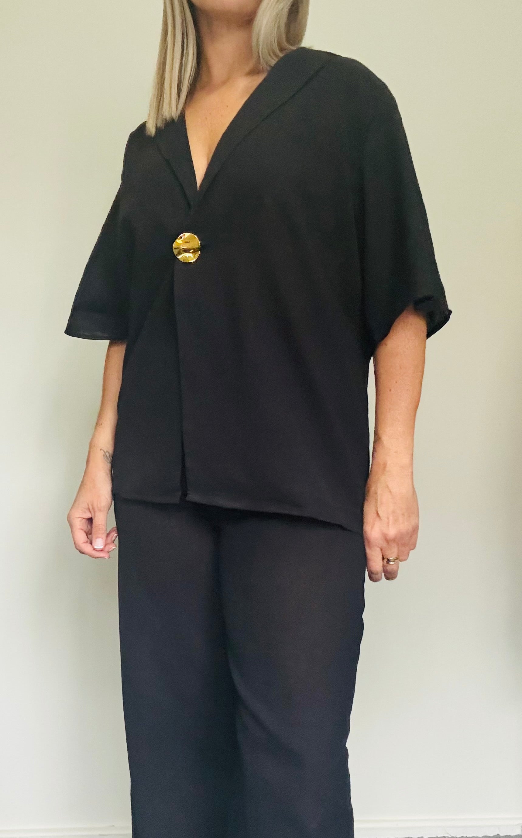 The Stella is a classic cotton two piece with a short sleeve top and long pants, finished with elegant gold button details. Easy to wear day to day, yet effortlessly elevated with heels and gold jewellery when you want a more polished, conservative look